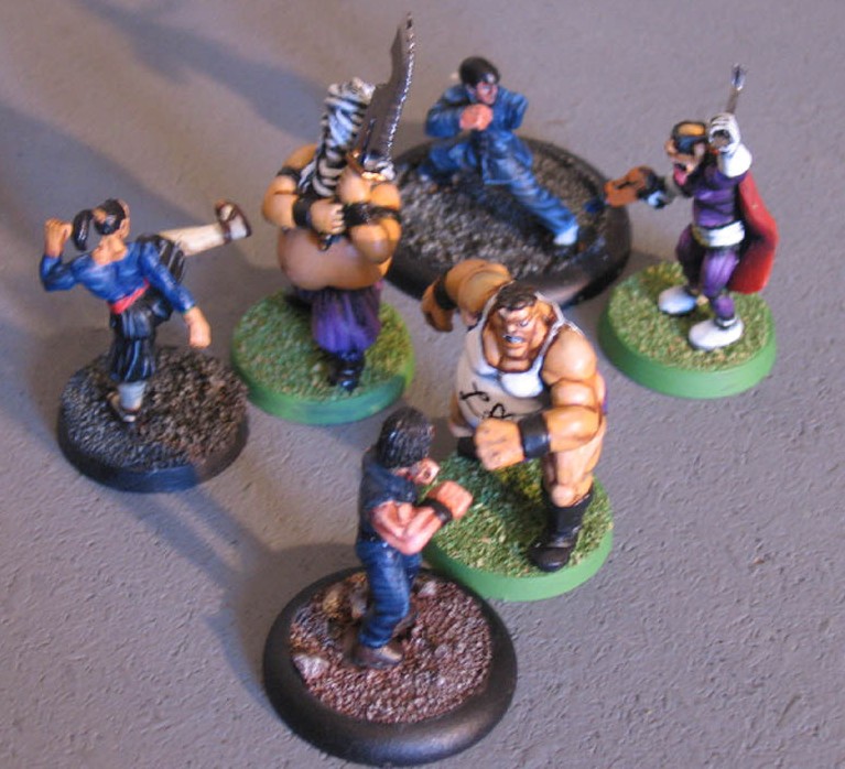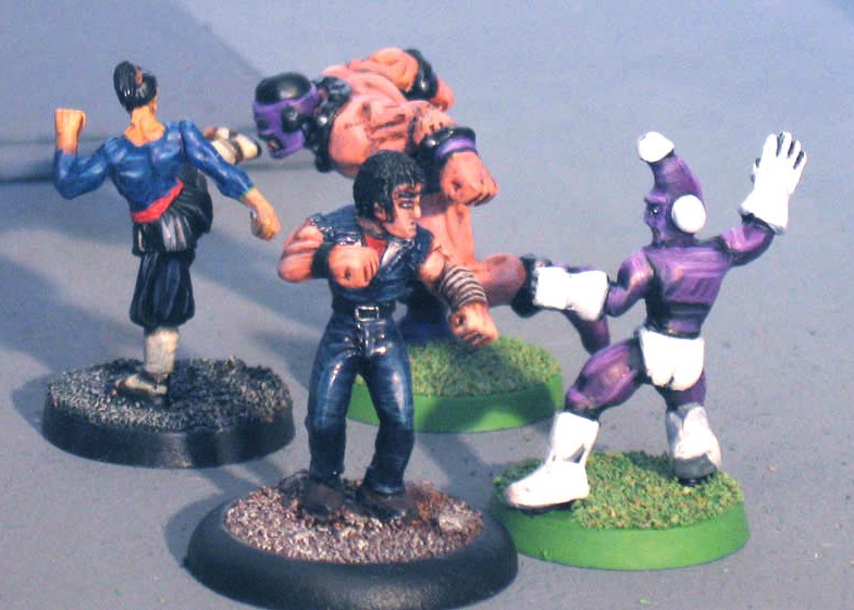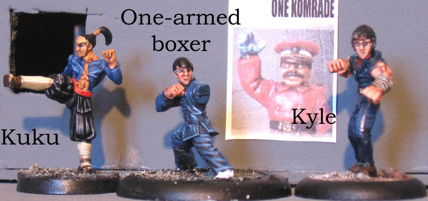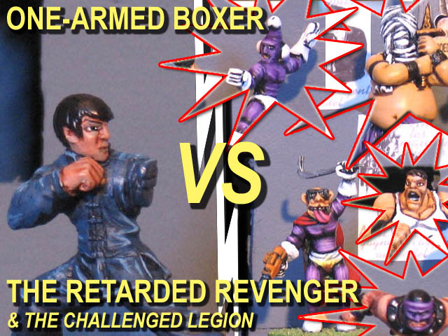![]() "Kyle, Kuku, you are my best disciples. You have attained great mastery in the ancient art of Kung-Fu, and it is now time for me to teach you how to transcend the possibilities of body and mind in armed and unarmed combat." "Yes, Master" "I have taught you how to win the fight. I have taught you how to lose the fight, with honour and modesty. Yet, you don’t know there is a third way in Kung-Fu. Now you must learn how to KILL the fight. To do so, you must learn how to see the animal within your opponent. You must learn to feel the beast breathing deep within his chest. To kill the man, before killing the beast. Only so will you kill the fight. But no word can teach you that. No word can give you the sense and feeling of killing the fight. Tomorrow, we shall leave our mountain and journey south. Leave the borders of Isisakai. To a place of evil – a place where man has long lost his soul and will show you the beast within. A place where you will either lose yours or fortify it." "Yes, Master" Kyle wasn’t sure he got precisely what the Master meant by "kill the fight", yet it reminded him of old songs he used to hear without understanding them when he was a child. Soon, he would know. And maybe have the honour of having his left arm cut off, too. Fanboyville, Redneckland – theatre of the greatest genocide since the Meteor; a place so deeply devastated by chemical and biological weapons none would think life possible within its area. Yet, despite the local authorities’ claims, the ruins of the city are still inhabited by a growing population of subhumanoid freaks. It is the place One-Armed Boxer has chosen to complete the training of his disciples, by an ultimate trial that might well be fatal to all of them. Attracted by the smell of urine near their encampment, the Retarded Revenger and his Challenged Legion are the ones Destiny chose to show the young monks… the beast within the man. Victory conditions : it couldn’t be more simple. Once you’ve smacked your opponent’s face and they’re knocked out, you’re the winner. Deployment : once again, it could hardly be more simple. Parties are deployed 15" away from each other. Go! Special rules : None Cast of characters One-Armed Boxer and his disciples