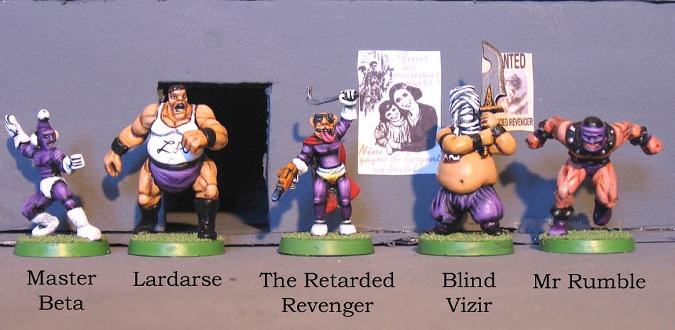 The Retarded Revenger’s existence was modelled by his mental health problems and by an unhappy childhood, as his family used his flat head as a beer-can tray, which even he eventually found was not quite right. At the age of 27, he fled from his village to start a new life in Fanboyville, and he swore to take his revenge on the averagely-brained. He soon gathered a small gang of challenged people who emigrated to Fanboyville for similar reasons and also sought recognition of their great talents. Lardarse, for example, may have weight problems – but he can eat nearly anything in any quantity. Pretty cool. The Retarded Revenger therefore appointed him ministry of Food of his Empire. Blind Vizir has decided to develop his perceptions, by obscuring his sight. Therefore, he always wears bandage over his eyes. His enhanced perceptions have no effect in game terms, except that he is affected by the stupid flaw, to represent the fact it actually isn’t that easy to fight without seeing anything. There is also something special about Mr Rumble. He’s got a passion for dashing towards people head on, making engine noises. He feels happy that way, it seems. Master Beta, finally, is a sexual monomaniac who claims he learnt all he knows about kung-fu (which amounts to… not much) from some Master Alpha.