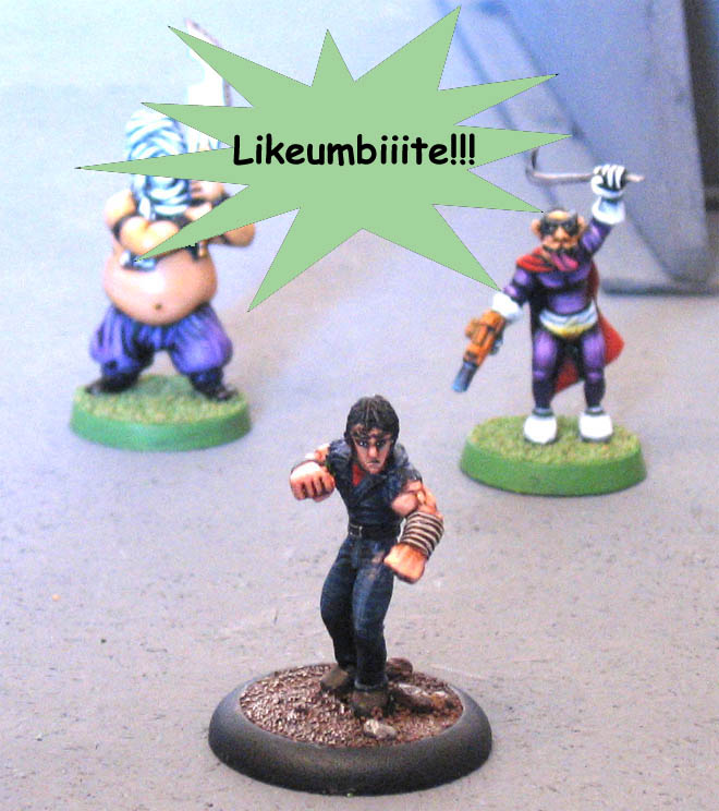 The Challenged Legion had the initiative, and showed a lot of discipline in their movement, as everyone preferred to advance rather than gaze at something in the distance. ![]() Kyle and Kuku charged the first two freaks facing them. Thanks to his years of training, Kuku could deliver a fatal blow to Mr Rumble, who immediately bit the dust, while Kyle punched Master Beta’s jaw into his throat – causing him to die in agony. Behind them, One-Armed Boxer observed his disciples’ work and proceeded quietly towards the mob of freaking retards. ![]() One-Armed Boxer saw a unique opportunity to strike the most dangerous opponent – he rushed towards him, when his superiorly developped senses warned him of a great danger. Too late: the Retarded Revenger had pressed the trigger of his piss-tol and already a acrid, stinky fluid reached his face, causing him to stop in surprise and disgust. Kuku and Kyle attacked the two fat monsters in front of them, who withstood their punches and kicks without any harm. Blind Vizir’s retaliation was fatal to Kuku, whose chest was sliced off his legs by the huge scimitar. Kyle, as for him, had no problem avoiding Lardarse awkward punches. The Retarded Revenger, obviously satisfied by his opponent’s horrified expression, charged One-Armed Boxer, who successfully parried each of his attacks with his single arm. ![]() Unfortunately for the martial artists, Blind Vizir, thanks to the strong smell of urine on One-Armed Boxer, had no trouble detecting his precise location, charged him and combined his efforts with the Retarded Revenger for a devastating massed attack on the Fist of Isisakai! Even his exceptional fighting skills weren’t enough to withstand the incredible fury of the freaks, and quite unexpectedly, the Master was defeated. ![]() Meanwhile, Kyle managed to get rid of the mighty Lardarse will a well aimed hokogishiwari in the eyes; after which he decided to bravely run away, confident that he wouldn’t succeed where his Master had failed. ![]() His training was now complete, though – and he was now confident that he would know how to kill the fight and take his revenge on the abhumans of Fanboyville. Unbelievable! How could a mighty hero by Hasslefree Miniatures (manufacturers of the best martial artists around) be defeated by a foul mob of retards? Certainly, the fantastic characters by En-Dépit-Du-Bon-Sens Studios weighed a lot in the final outcome, but that was nonetheless quite surprising. Another (very minor) factor might be the huge discrepancy in dice rolls, though… Next time, it might be a good idea to involve more characters by our other great sponsors to even things out, like East Riding Miniatures 22nd Century Corporate World assassins, Obelisk Miniatures Gangstars, or Olley’s Armies ghouls... Back to the main page |