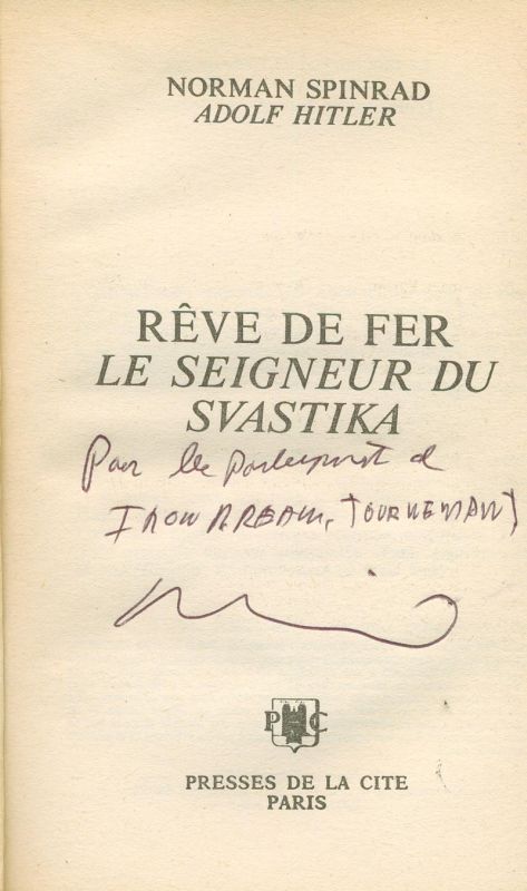 ![]() Yes, that's Norman Spinrad's signing on a french copy of his silly dark-humoured science-fiction novel "The Iron Dream". The text is "Pour les participants du Iron Dream Tournament" ("to the participants of the Iron Dream Tournament") Brought by Slereah who met Mr Spinrad during Les Utopiales, a science-fiction convention in Nantes, France.